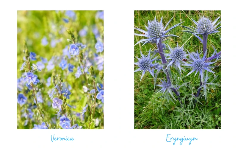 Lorsque nous sommes arrivés, le grand pré à chevaux était recouvert de petites fleurs bleues appelées "Veronica" qui donnaient une coloration bleutée étonnante. Ensuite il se trouve que nous avons planté des Chardons bleus en tout premier (Eryngium et Echinops).